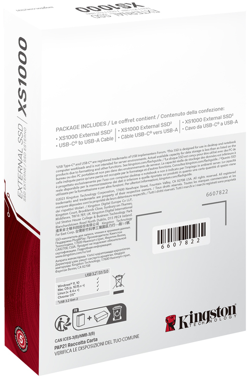 De Kingston XS1000 externe SSD van Kingston biedt 2TB opslagcapaciteit in een compact en duurzaam ontwerp van metaal en kunststof. Met USB 3.2 Gen 2 via Type-C haalt de SSD leessnelheden tot 1050 MB/s en schrijfsnelheden tot 1000 MB/s, ideaal voor grote bestanden en intensief gebruik. De drive is compatibel met Windows, Mac, Linux en diverse mobiele besturingssystemen, waardoor flexibiliteit gegarandeerd is. Lichtgewicht en draagbaar met een gewicht van slechts 44,8 gram, geschikt voor onderweg. Inclusief USB-C naar USB-A kabel voor eenvoudige aansluiting op verschillende apparaten.